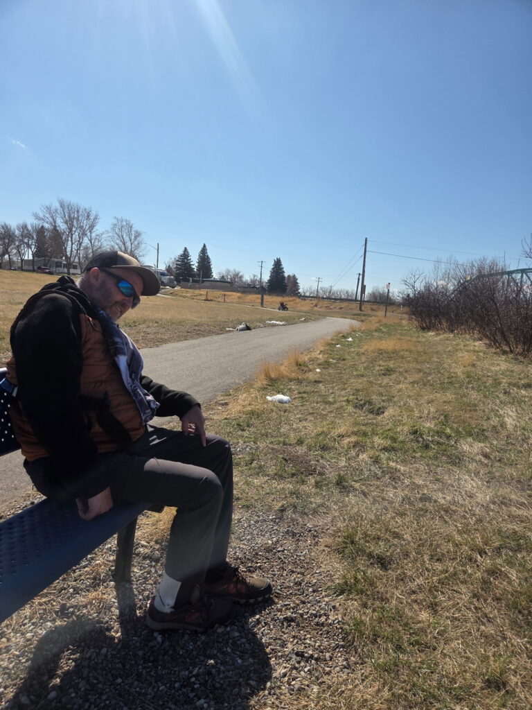 Earlier in the week, Mike and William went to spend some time outdoors in the beautiful weather, and ended up on the paved path along the river. They stopped the wheelchair well before the bench and William helped Mike walk about 100 steps to the bench. (William says it seems a lot farther when walking backwards and trying to stay balanced!! Lol)