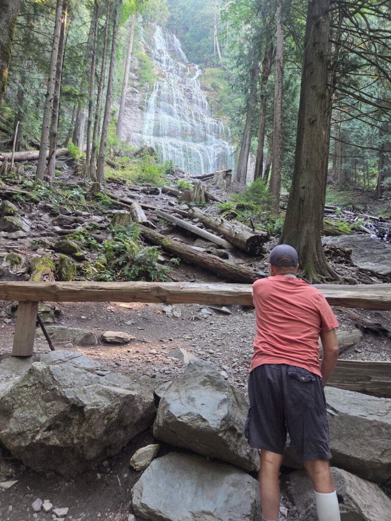 William had a lot of ideas of things to do while in Chilliwack, including hiking to Bridal Veil Falls. I had my doubts, because although I remember it being a fairly wide path, it is a very different story while pushing a wheelchair over a soft bed of pine needles and over slippery roots!